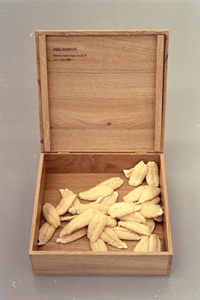 Material: Eichenholzkisten beschriftet, transparente Plastikfolie, Salzteig.