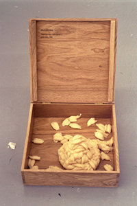 Material: Eichenholzkisten beschriftet, transparente Plastikfolie, Salzteig.