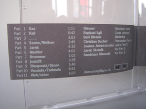 „Musik im Rauschen?“, versteht sich als CD der Grundstrukturen, welche sich nicht an kompositorischen Regeln orientiert, sondern nach eigener Logik funktioniert. Cover-Gestaltung: Raphael Egli.